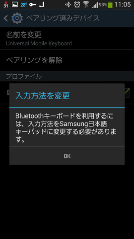 こんな表記が出てしまいます。入力ツールは自分好みのものが使えるというのがアンドロイドの優位点でありますが、Bluetooth接続でのキーボードプロファイルでは機種デフォルトでしか動かない、という警告です。もちろん私も従来から使い慣れた、別入力ツールを使っています。