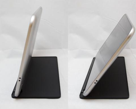 スタンド角度は 2段階で使うことが出来、溝内のストッパーにデバイスの端をかける位置(上下)によって変えられます。