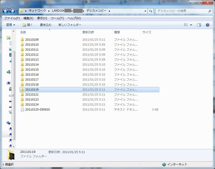 コピー先はdiskフォルダにデジカメコピーというフォルダができて、その中に。そのフォルダを開くと多数のフォルダができてましたが、これは写真の日付ごとにフォルダができたようです。ログも残るようになってます。