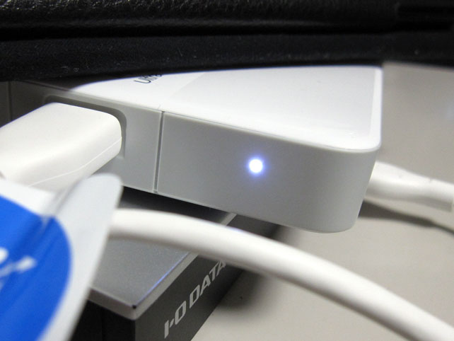 コネクタ差込口の右横の小さい穴は、アクセスランプです。つなぐと白色にずーっと光ります。アクセス中は点滅。こればかりは人によるかもしれませんが、私は昼間に利用することが多いので、それほどまぶしくはありませんでした。