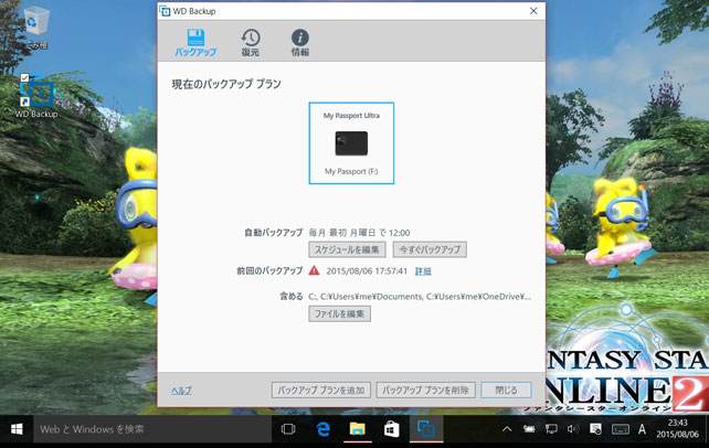 今回はこのバックアップを「My Passport Ultra」のソフトウェアで行いました。もし、いろいろ壊れてしまっても、「復元」すれば、前と同じデータが戻ってくるはず!(本当?)