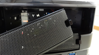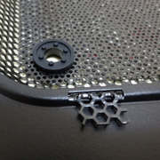 サイドパネルは金属のメッシュになっており、爪を立てることで取り外せる構造になっているようです(写真3枚目)。ネジ穴も開いているので、ここにファンを4つまで取り付けられるようになっています。