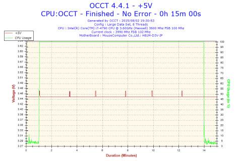 ちなみにOCCTテストを行いましたが、+12Vの結果が空白……というか項目自体が存在してない……。調べてみましたところおそらく、GIGABYTEのマザーボードが特殊な電圧センサーを使っているために起こる現象のようです。一番気になる12Vがわからないとは……ぐぅ。ひとまず+5Vと+3.3Vの電圧だけ見てみます。全体的に電圧低めです。