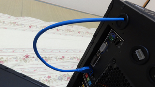 前面には、USB2.0ポート2つにUSB3.0ポートが1つ、そしてマイクとイヤホンのジャックが1対あります。リセットボタンもついています。背面から出ていた青いケーブル、これを背後にあるUSB3.0のポートに接続することで、前にあるUSB3.0ポートが有効になります。