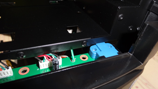 前面のメッシュ部分は、簡単に外れます。最上部のパネルをはずすと、前面のコネクタの中身が見えます。ちなみに右側の写真の青い部分がUSB3.0で、ここから背部に青いケーブルが延びています。