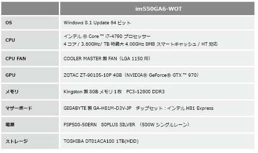 日本製の高性能PCと手厚いサポートで高品質なPC体験を提供する、というのがコンセプトというわけですね。推奨するからにはどれほど快適にWorld of Tanks(以後、WoTと略します)をプレイできるか気になるところです。というわけで、その高性能PCであるim550GA6-WOTのスペックを見ていきます。