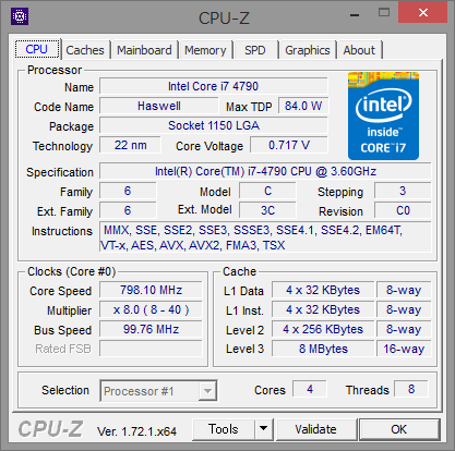 L1キャッシュ:32KB×4 / L2キャッシュ:256KB×4 / L3キャッシュ:8MB