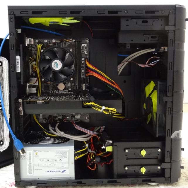CPUファンはリテール品ではなくクーラーマスター製です。また、ケースファンは前部に2箇所、天井に1箇所、背面に1箇所取り付け可能です。