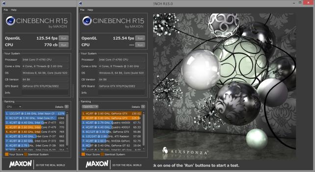 最後にCINEBENCH。フレームレートは125.54fps、CPUは770cbを計測しました。旧PCでは63.42fpsに301cbでした。CINEBENCHのCPU側のスコアは、純粋にCPUの処理速度を計測しますので、少なくともCPUの性能は単純計算で2.5倍と言っていいと思います。