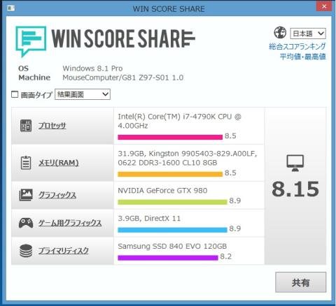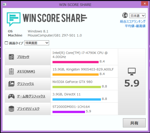 WinScoreShareのスコア(換装前)が最初に表示されているのは分かり易くて良いですね。