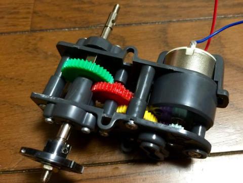 調べに調べた結果、タミヤの低回転ギアボックスを採用。便利なキットがあるものです。