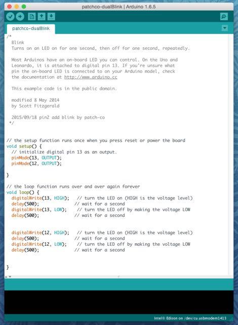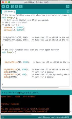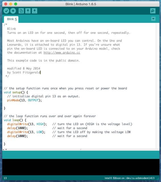 一番簡単な動作確認として、スケッチサンプルに含まれる、「Blink」をedisonに転送して確認する方法があります。他のレビュアーさんも紹介しておりますが、ボード上にもっているLEDランプを点滅させるだけのスケッチプログラムです。