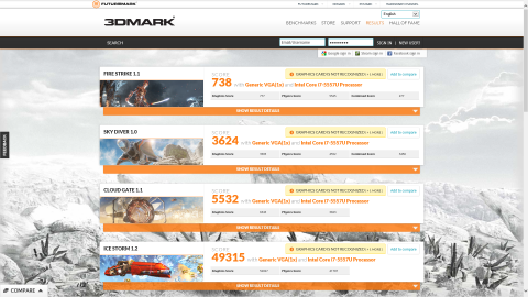 ICE STORM: 49315, CLOUD GATE: 5532, SKY DIVER: 3624, FIRE STRIKE: 738