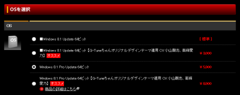 標準はWindows 8.1 Update 64ビットのため、長く使用するなら機能の多いWindows 8.1 Pro Update 64ビットへの変更がお勧めです。