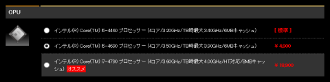 CPUは標準のCore i5-4460でも十分高性能ですがCPU単体での販売価格の価格差を考えるとCore i5-4690も割高感がないのでお勧めです。余裕があるならHTTで4C/8Tの高性能なCore i7-4790を選んでしまうのもアリです!