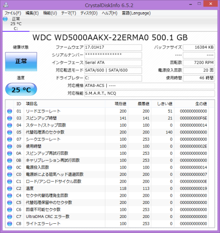 HDDはWD製の”SATA 6.0Gb/s、7,200rpm”のWD5000AAKX 500GBモデルを採用。