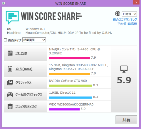 エクスペリエンス インデックス(WinScoreShare)のスコアはCPUとメモリが0.1上昇!