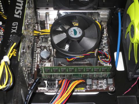 カチッとしっかり音がして挿さっていることを確認してください。(*用意したメモリは同じ型番ですがロープロ対応品のため背の高さが異なりますがデュアルチャンネル動作の安定性は確認してありますので問題ありません。)