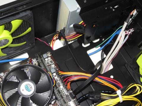 電源ケーブルはタイラップで固定されているのでニッパーでタイラップを除去してドライブの所まで伸ばします。SSDの追加も考慮して一番手前のコネクタを利用しました。あまったケーブルは空いているなら5インチベイの下にある3.5インチベイにいれてしまうとスッキリします。