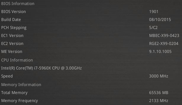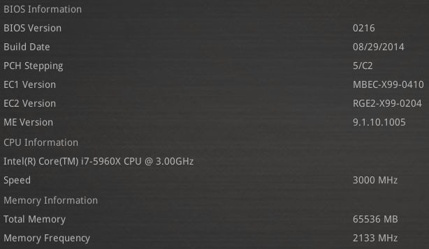 BIOSのアップデートは失敗時が痛いので、必要に迫られなければやらないのだが、ASUSのM/Bは比較的簡単にBIOSがアップデートできる。ASUSのサイトから落としたBIOSファイルを説明書にある通り(このボードの場合「X99A.CAP」)にリネームしてFAT形式のUSBメモリに仕込み、裏の特定のUSBポート=USB BIOS Flashback ポートに挿し、USB BIOS Flachbackボタンを長押しし、ランプが消えるまで放置...というだけ。