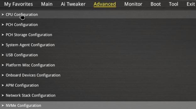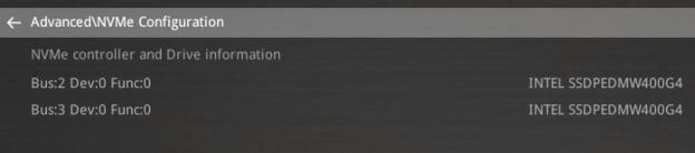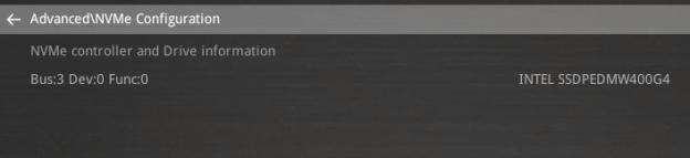 これでBIOSのメニューに「NVMe configuration」という項が現れ、SSD750が認識できるようになる。