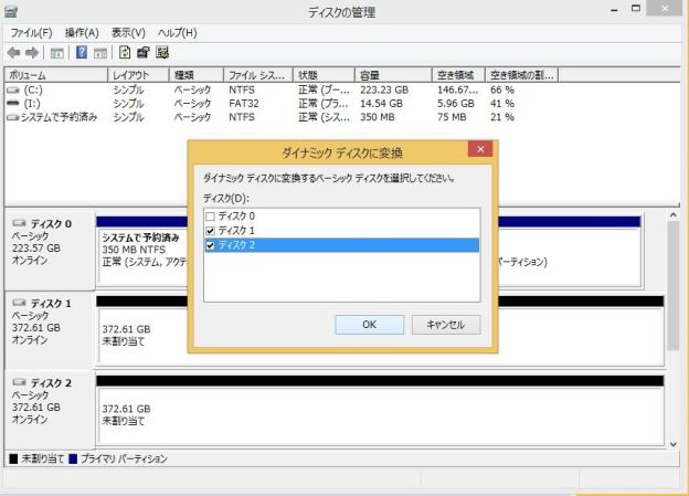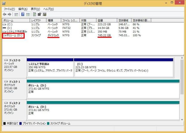 ダイナミックディスクに変換するとストライプボリュームが組める