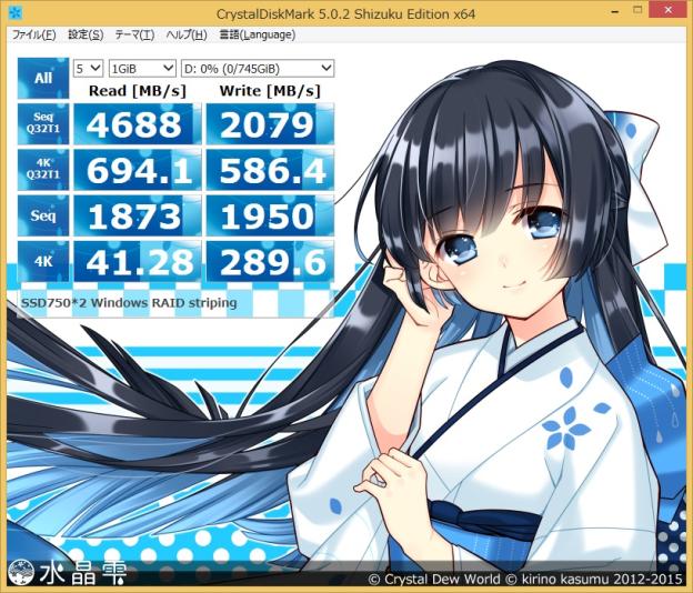 シーケンシャル系の一部の項目は4桁に乗せているので、元環境(Z87チップセットのRAID機能)よりよい数値だが、SSD750×2を見たあとだとインパクトに乏しい。
