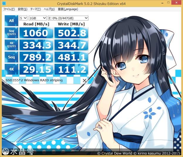 ちなみに同じ環境で(もちろんSATA接続だが)組んだWindowsのストライプボリュームでの他のSSDの性能は以下の通り。