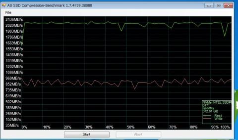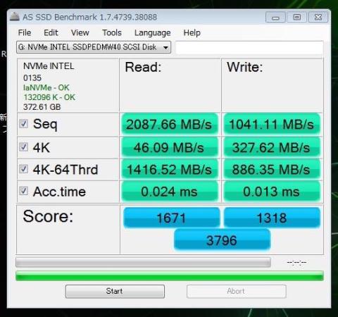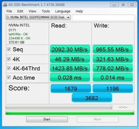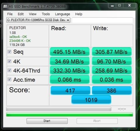 AS SSD Benchmarkでは、メモリの速度が遅いのが影響しているのか、アクセスタイムが遅くなり、