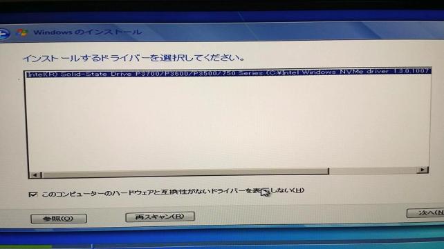 先ほどまで何の記憶媒体も表示してくれていなかったインストール画面に 【intel ssd 750】 が表示されました。