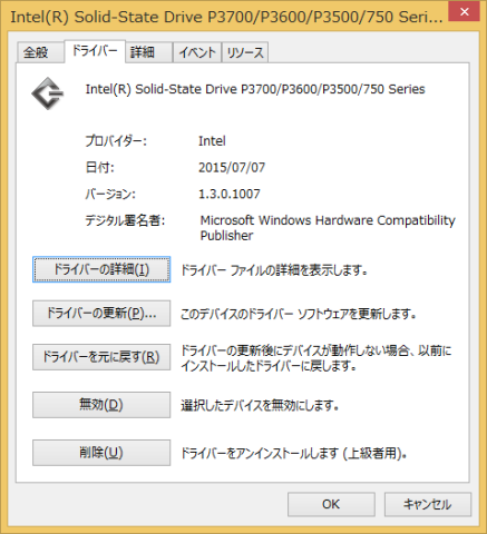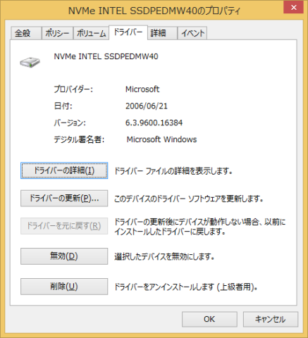 ちゃんと見えてる。どうやら、NVMeドライバはインスコされてるということらしい。ところが、デバイスマネージャでSSD 750を探すとディスクドライブにNVMeドライブが2つ表示されてるから、ドライバを確認しようと思ってみてみると、何故かMicrosoft製、しか も2006年とか古すぎる。なんかおかしい。