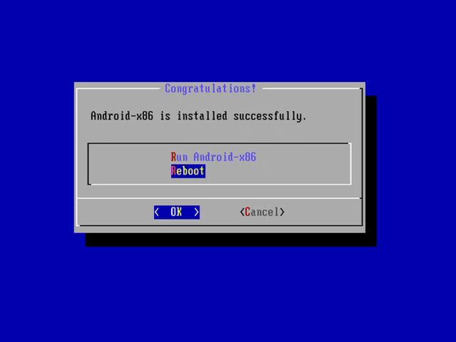 インストールが完了しAndroid-x86を起動するか再起動するかを選択する画面に