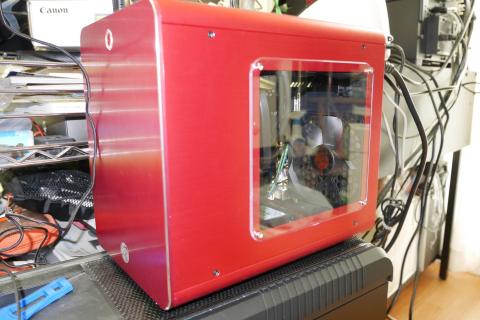 そこで、ケースを超小型に新調することにした。採用したのは「GYGABYTE ESSENCE」このモデルは赤黒を基調としたケースで、内部フレーム+樹脂ケースの二層構造を取る。カッコイイ奴だ!