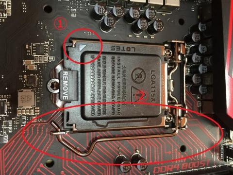 CPUを載せ、レバーを倒し、上側の赤丸部分のようにロックをします。