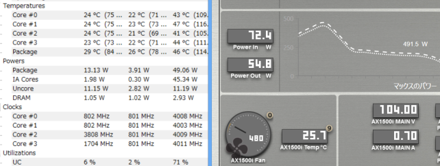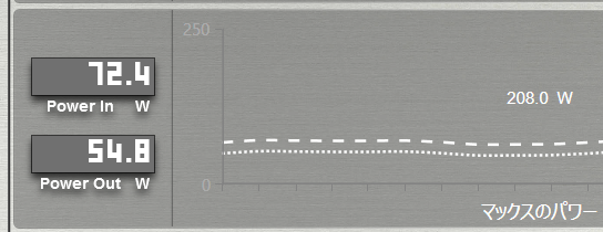 ファンコントロールは14センチファンX2で、50度を超えると一段目のファン速度上昇で50%前後、約1300RPMほどで動きます(まだ静穏)1800RPMあたりが上限なので、その辺になると