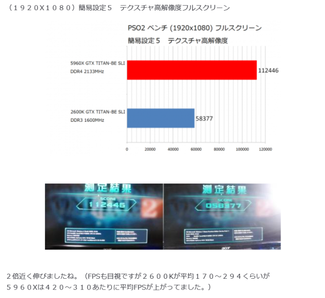 1920x1080のデータはDSRで疑似4K化してあるので、それが影響してるのかもですね。。。もしくは、TITAN-BEのほうがPSO強い。。。(5960X)も逆転してるので・・