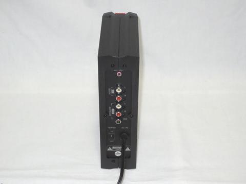 コントロールボックスは電源LED、音量調整、低音調整用ボリューム、入出力端子が集約されています。縦置きデザインですが専用のゴム足(シールタイプ)が付属しているので横置きにも対応します。