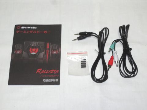 付属品は説明書(日本語)、コントロールボックスの横置き用ゴム足(x5)、ステレオミニケーブル、ステレオミニ>ステレオRCAケーブルが付属しています。