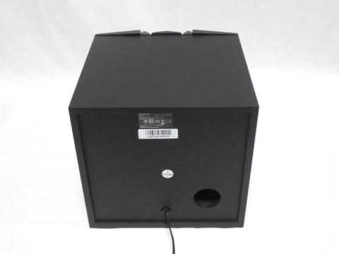 サブウーファーの後ろ側はコントロールボックスへの接続ケーブルとバスレフ式の穴があります。