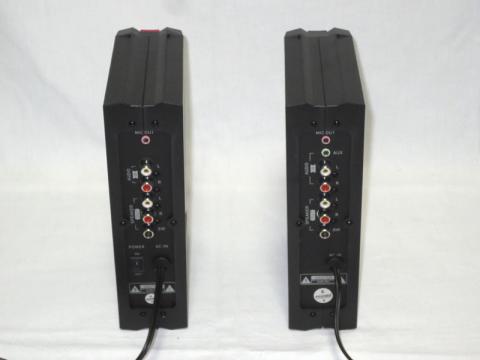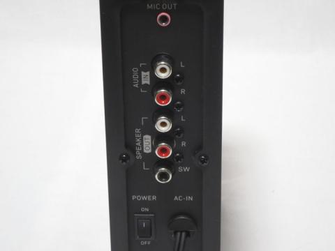 コントロールボックスの背面はマイクアウト、ステレオRCA入力、スピーカー接続端子、メイン電源スイッチが並んでいます。