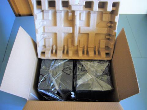 外箱の上側を開けると、しっかりと成型された段ボールでスピーカーが固定されてます。