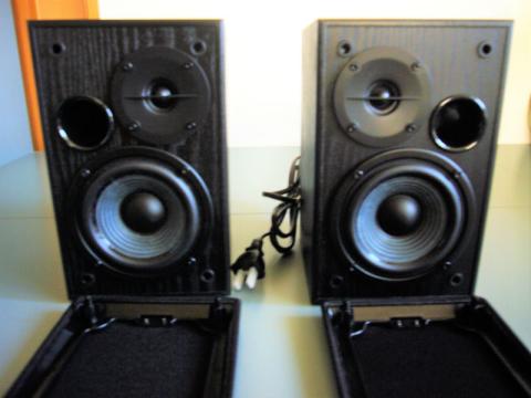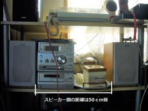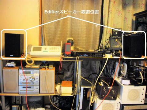下記の写真のEdifierスピーカー設置位置にR1100とR1000TCNを交互に設置し、 MDミニコンポCMT-J100付属スピーカはソニーが本体の横にスピーカーを設置するのがベターだとの思想で作られているので、この状態で比較を行います。