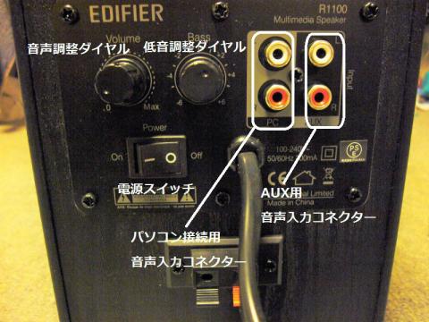 右スピーカーには、「音量調整ダイヤル」、「低音調整ダイヤル」、「音声入力端子」が2系統(PC用とAUX用)、「電源スイッチ」が有ります。