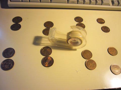 理由は10円玉の中央部は少し凹んでいるので、両面テープ2枚で厚みを出して接着を確実にする為と、最も外側が少し中央部よりも凸っているのでそこでも接着させる為です。