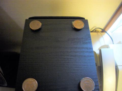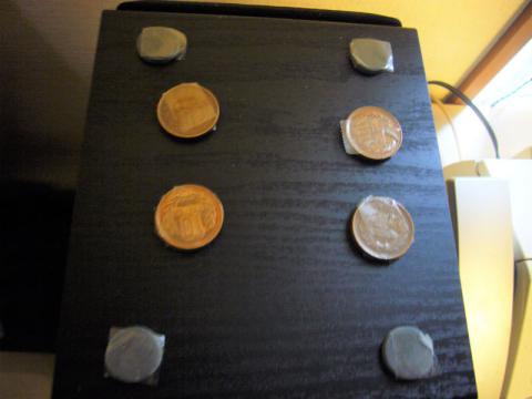 10円X2枚X4ゴム足Xスピーカ2本=160円+アルファと格安で簡単なインシュレーター設置完了です。