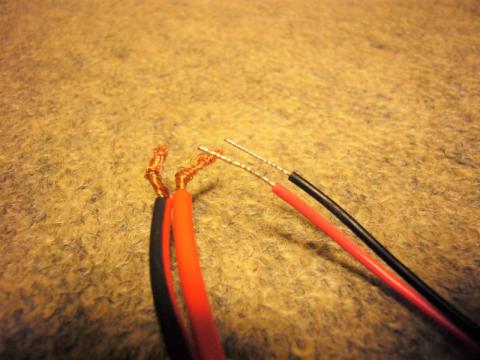右側がR1100付属スピーカーケーブルで細いです、左側は 1.25m㎡スピーカーケーブルとしてホームセンターで購入したものです。