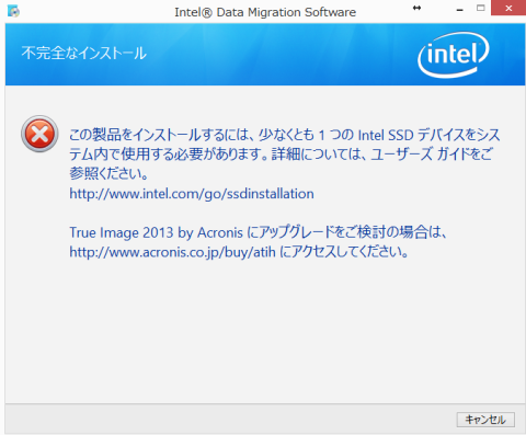 インテルのSSDをPCにつながない状態でソフトをインストールしようとすると以下の文面が