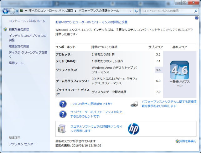 Windows エクスペリエンス インデックスの計測結果の比較です。