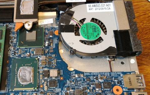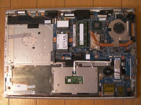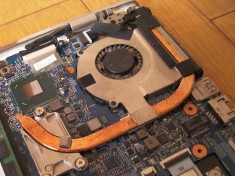 画像左下がCPU、左上が放熱板です。放熱板から冷却ファンにヒートパイプで繋がっています。