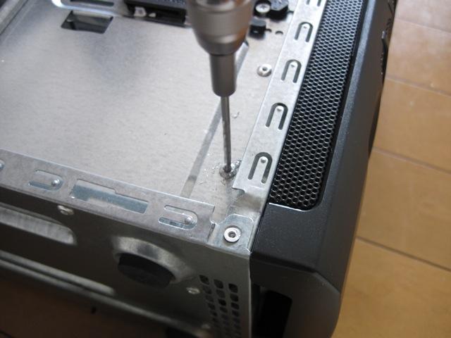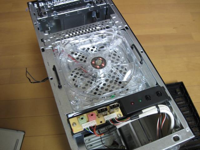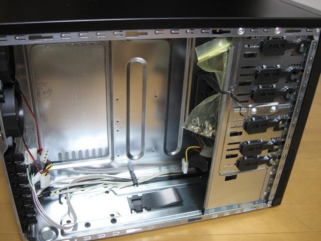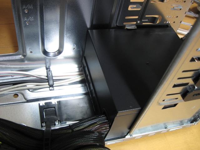 内部の真ん中にある黒いプラスティックは電源の固定具のようですけれど、この筐体にはたぶん長さ140mmのケースしか使えないと思います。